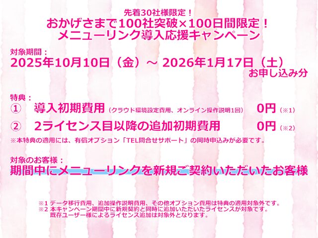 「おかげさまで100社突破×100日間限定!メニューリンク導入応援キャンペーン」のお知らせ